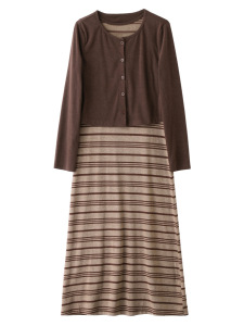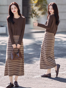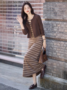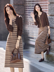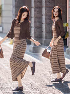 韩系气质条纹连衣裙套装2025秋新款洋气减龄显瘦开衫背心裙两件套