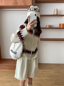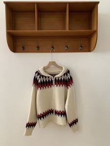 复古文艺费尔岛毛衣外套女减龄少女翻领针织开衫韩版秋冬拉链开衫