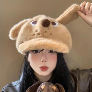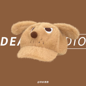 怒气可爱小狗狗毛茸茸耳朵贝雷帽女冬季保暖棕色毛绒大版棒球帽子