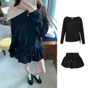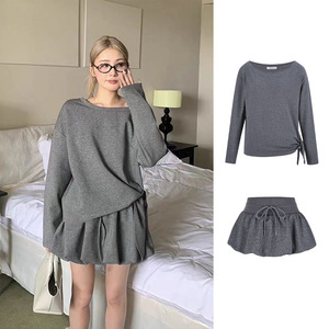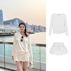 Moses魔西女王韩版初秋宽松慵懒风圆领T恤上衣高腰抽绳花苞裙套装