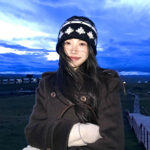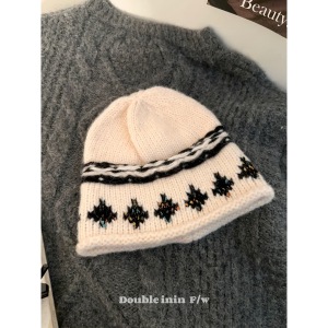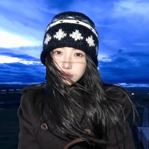 复古提花费尔岛针织毛线帽女秋冬保暖显脸小包头帽卷边冷帽爆款