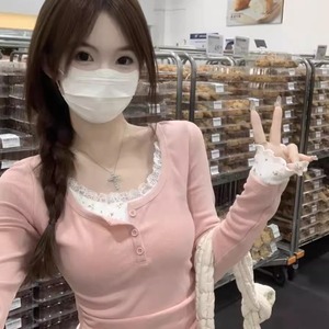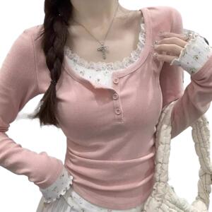 法式蕾丝碎花拼接T恤女2025春秋新款修身显瘦假两件辣妹chic上衣
