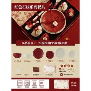 【锦盒装】红色石纹餐具13件套-(4碗4盘)