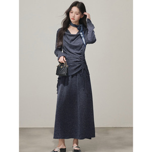 实拍 2025秋冬韩版不规则设计感荡领长袖T恤上衣+半身裙两件套套