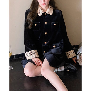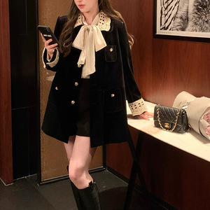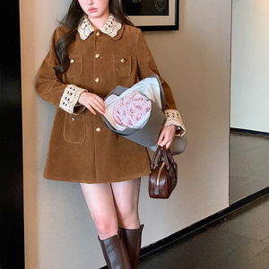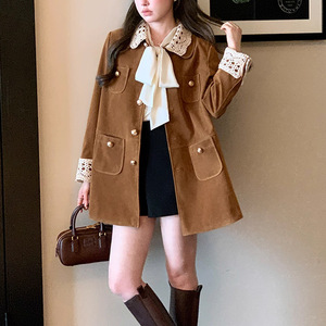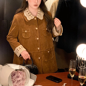 法式秋MIU系复古翻领中长款麂皮/丝绒外套工装风衣女 美拉德穿搭