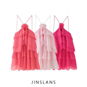 跨境外贸批发秋季新款ZA女装欧美风时尚三色叠层荷叶边短款连衣裙