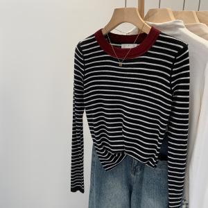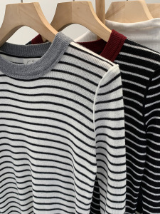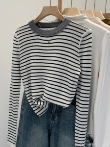 早秋高级感条纹圆领内搭长袖针织衫女2025新款修身显瘦漂亮小上衣