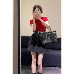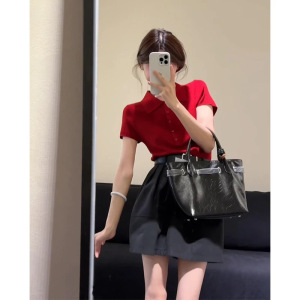 网红洋气炸街POLO领红色针织衫短款上衣高腰半身裙套装