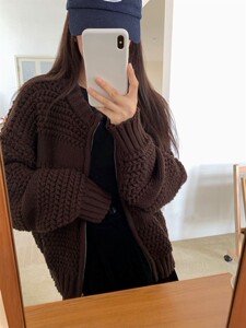 复古重工菠萝针粗针织毛衣外套女秋冬季宽松加厚保暖拉链针织开衫