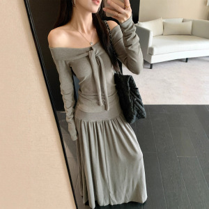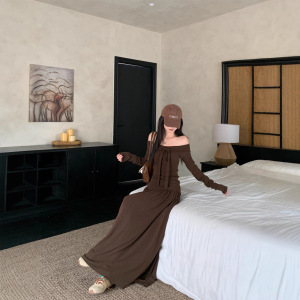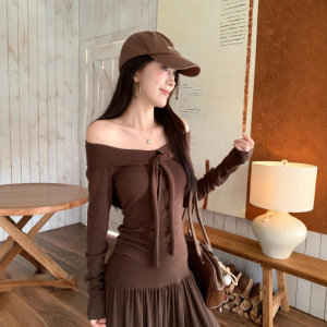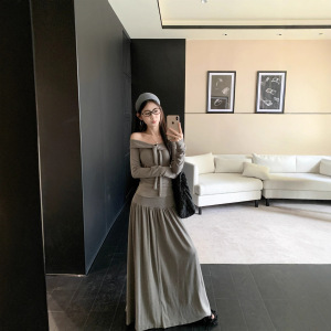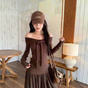气质套装绑带长袖T恤一字肩上衣女秋季高腰垂感半身裙长裙两件套