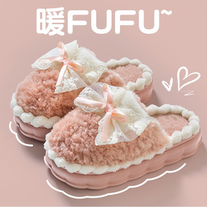 蝴蝶结棉拖鞋女款冬季2025新款室内家居厚底防滑保暖毛毛拖鞋女士