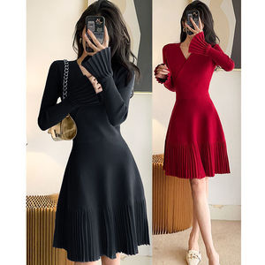 新年气质红色法式针织连衣裙女收腰修身长袖秋冬打底显瘦过年战衣