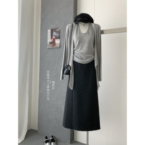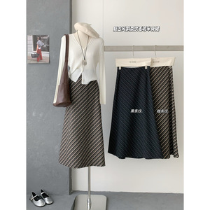 条纹高腰遮跨中长裙女2025秋季新款韩版通勤百搭a字半身裙