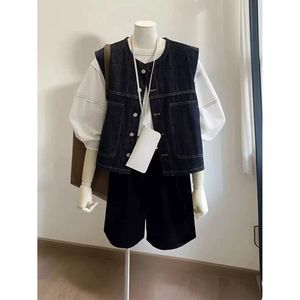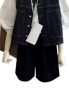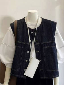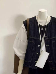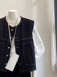 夏季新款深蓝圆领复古牛仔马甲休闲独特黑色秋季外套短款坎肩背心
