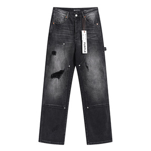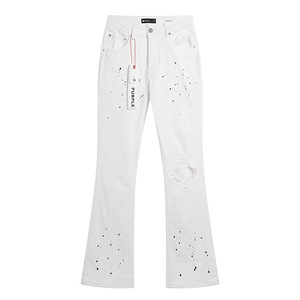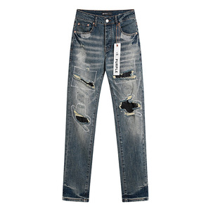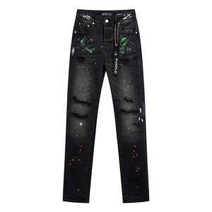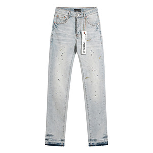 跨境Purple Brand直筒微弹力牛仔裤复古做旧泼墨破洞小脚牛仔长裤
