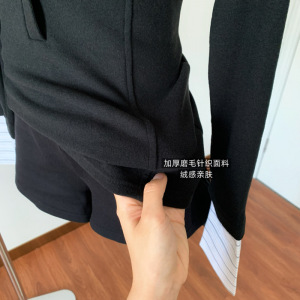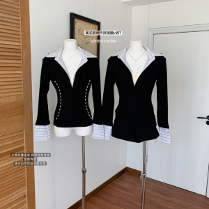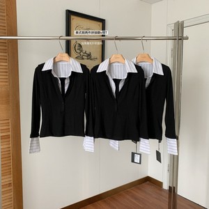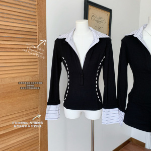美式假两件拼接翻v领T恤女2025春秋新款气质高级设计感上衣