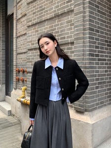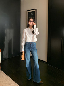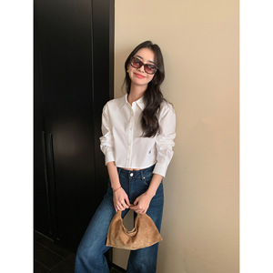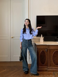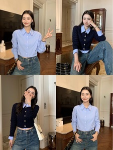 pusumede 时髦玩家 蓝色条纹衬衫女刺绣叠穿衬衣休闲短款气质上衣