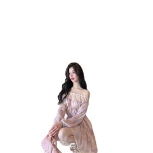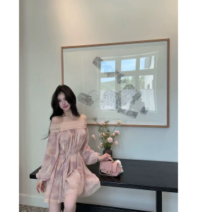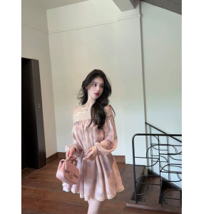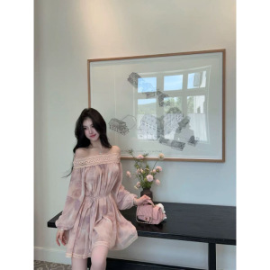 纯欲风粉色一字肩雪纺连衣裙秋季新款法式气质短腰蕾丝灯笼袖裙子