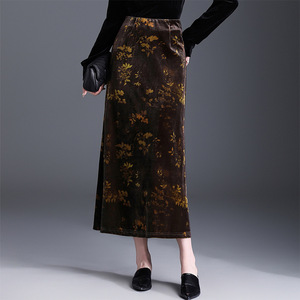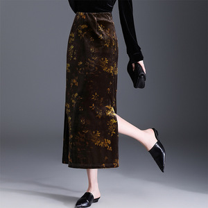 印花金丝绒职业半身裙女2025秋冬新款光泽感侧开叉包臀直筒中长裙