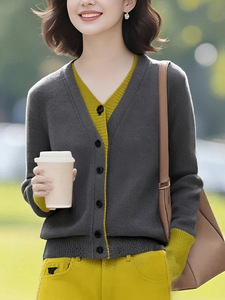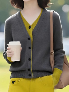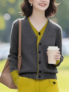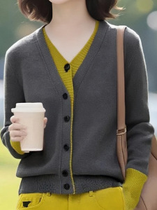 灰色V领毛衣女士秋冬慵懒高级感休闲显瘦假两件打底针织开衫上衣