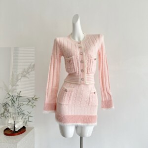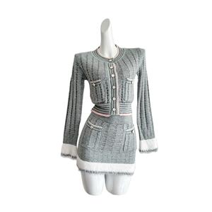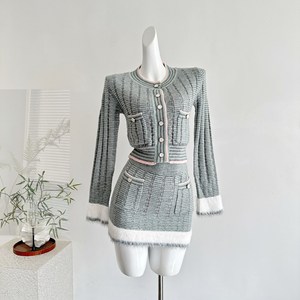 2025实拍秋季新款宽松拼接纱线毛感针织上衣+半裙套装