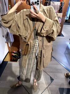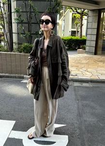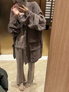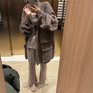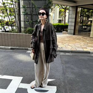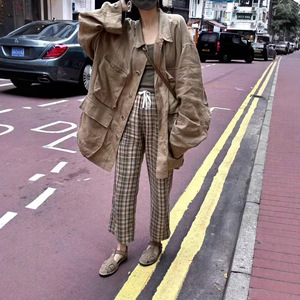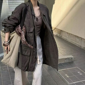 秋款倪妮同款穿做旧工装风休闲外套亚麻防晒多口袋个性翻领上衣