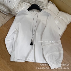 袖子拼褶花边拼袖设计感长袖T2025秋季新款宽松休闲显瘦长袖T