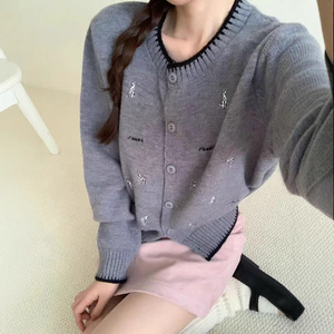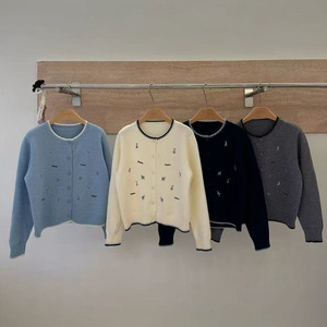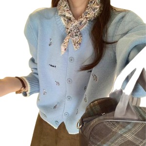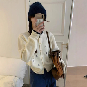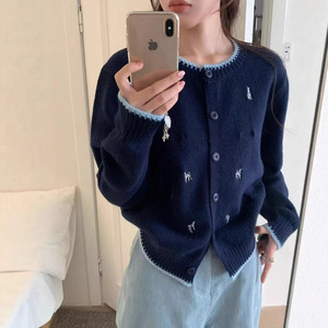 温柔蓝色刺绣百搭圆领长袖针织开衫女秋季新款拼色系扣毛衣外套潮