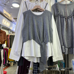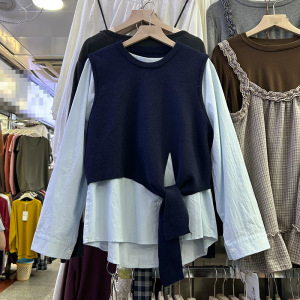 设计感叠穿两件套长袖衬衫女2025秋冬新款百搭针织马甲上衣527M