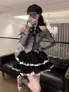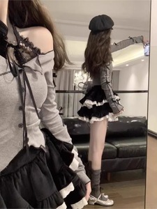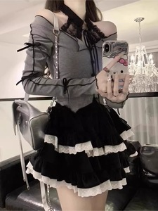 甜辣风蕾丝挂脖T恤女秋季芭蕾黑色灯芯绒短裙上衣蓬蓬蛋糕裙套装