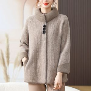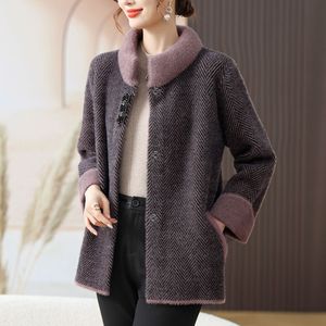 妈妈秋冬仿水貂绒洋气外套新款中老年女时尚加厚毛呢开衫上衣