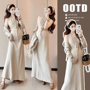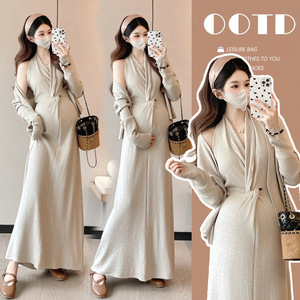 孕妇装V领修身显瘦两件套时尚套装女人味针织孕妇长裙