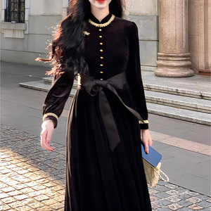 ZHOYUE宫廷风枫糖黑巧'法式黑丝绒长袖裙女秋季系带A字连衣裙立领