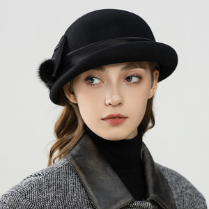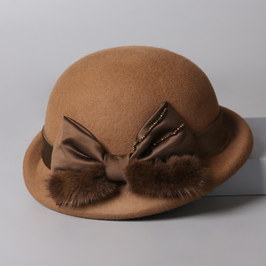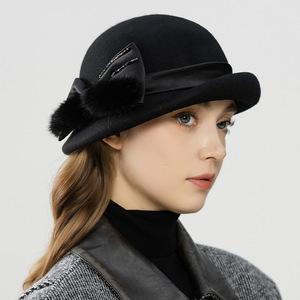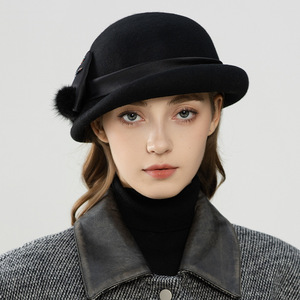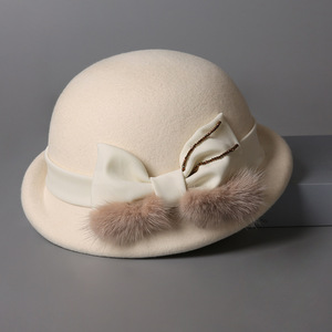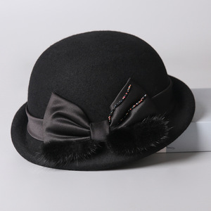 法式赫本风蝴蝶结水貂毛渔夫帽子女秋冬羊毛礼帽优雅保暖盆帽批发