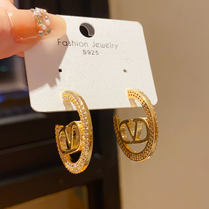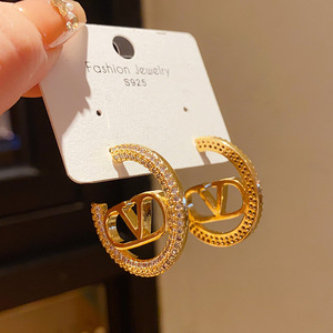 18k真金电镀银针轻奢锆石圆形字母CD耳钉个性高级感小众简约耳环