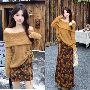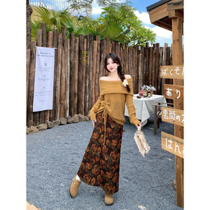 纯欲一字肩长袖针织衫碎花半身裙胖mm秋季新款2025时尚两件套