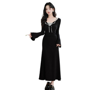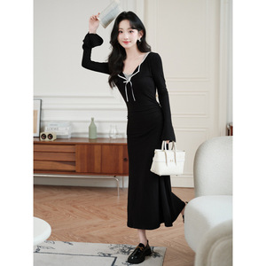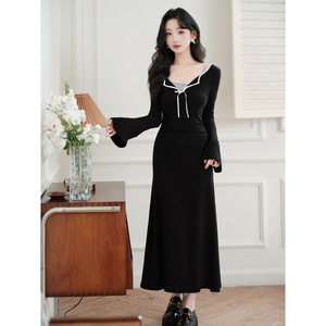 法式复古针织长袖假两件超好看的早秋连衣裙修身显瘦赫本风小黑裙