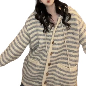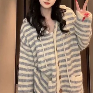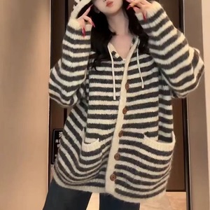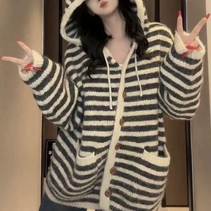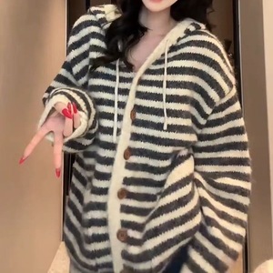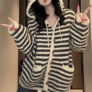 秋冬针织开衫女2025秋冬新款外套连帽纽扣宽松慵懒风条纹长袖毛衣