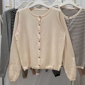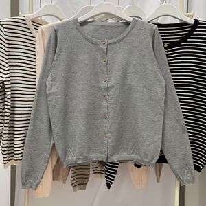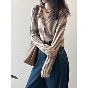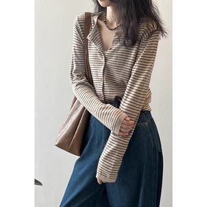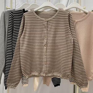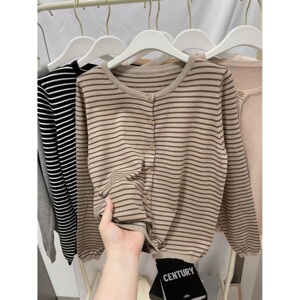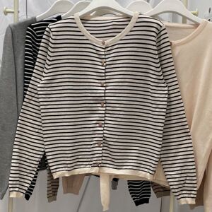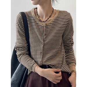 温柔韩系撞色条纹针织开衫女早秋软糯长袖打底衫修身圆领短款外套