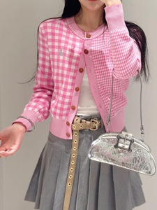 现货西太后vivi拼接双格开衫设计感土星圆领格子显瘦针织开衫上衣