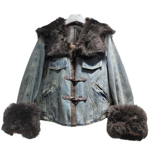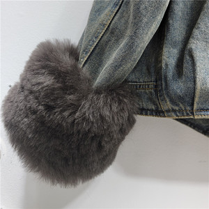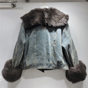 欧货皮毛一体拼接牛仔派克服女短款复古做旧加厚仿皮草外套