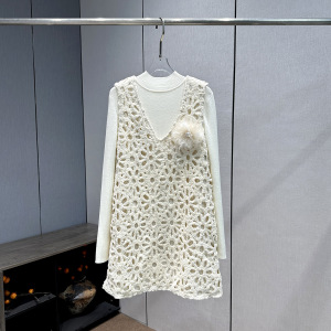深圳南油半高领打底衫镂空花朵V领背心裙两件套女2025年秋季新款