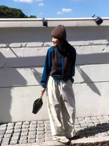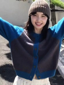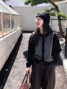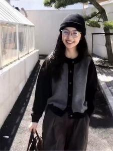 100%纯羊毛衫女撞色圆领百针织开衫秋冬宽松毛衣羊绒外套套拼色