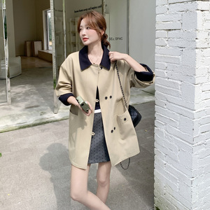 实拍卡其撞色翻领风衣外套2025秋款气质百搭显瘦英伦风小个子大衣