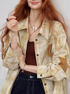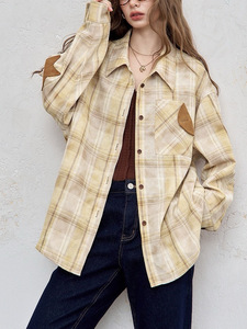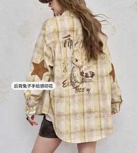 妖精的口袋原创手绘兔子印花长袖衬衫女2025秋季新款复古格纹上衣
