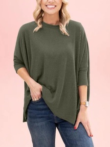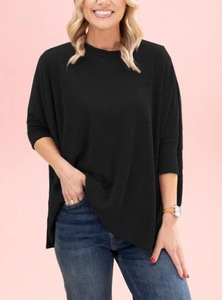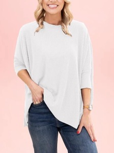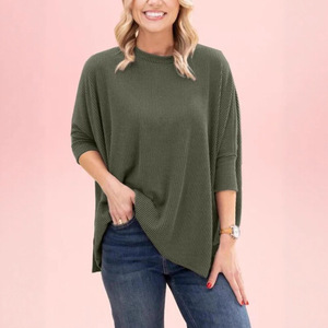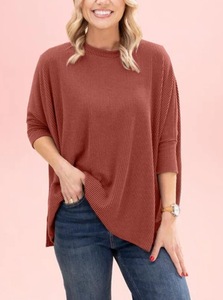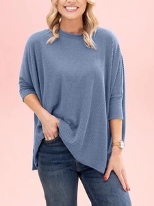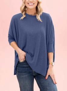 欧美跨境女装亚马逊2025秋季新款波浪条纹宽松休闲七分袖开衩上衣