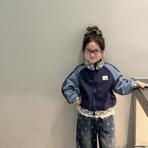 女童2025秋季新款印花长袖加绒外套花边打底衫加绒牛仔裤三件套潮