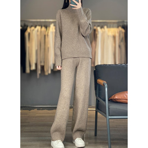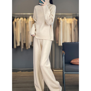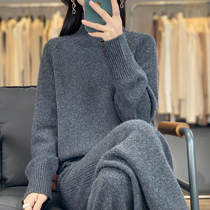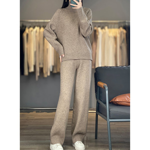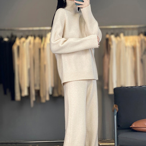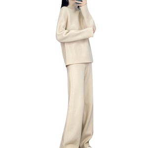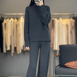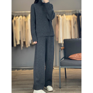 2025年秋冬新款高领纯羊毛慵懒风针织衫插肩长袖高腰阔腿裤两件套