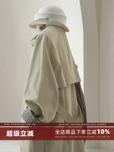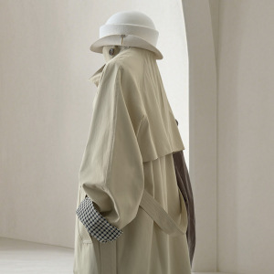 4U4U浅卡其色立领风衣女春季新款复古港风袖口格纹拼接设计感外套