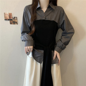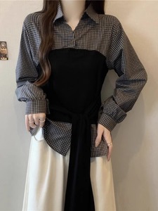 格子拼接长袖衬衫秋季2025新款大码女装胖mm收腰遮肚小衫上衣